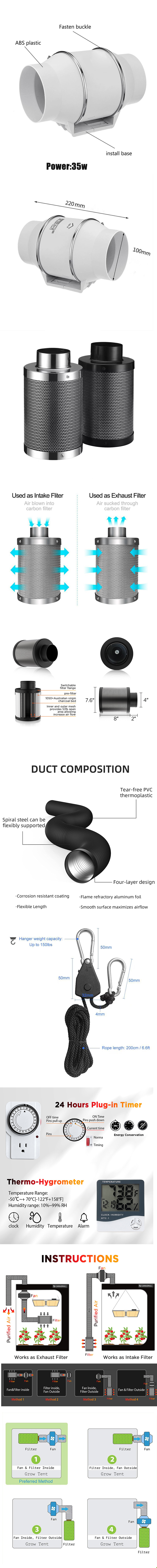 4-inch afzuigventilator*1Actiefkoolfilter*1Hygrometer*1Timer*12 meter lange pijp*1Pijpklem*2Hijstouw*2