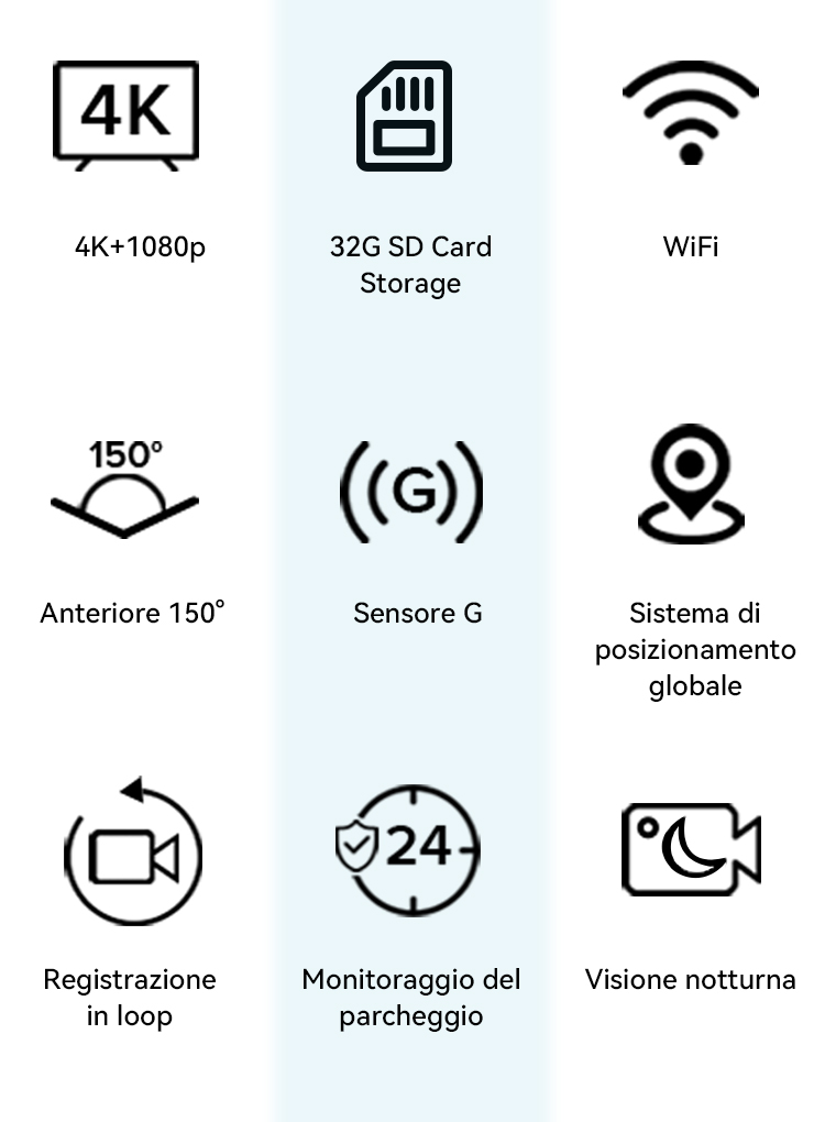 • Functies: Wifi/GPS/ADAS/G-Sensor/Stemprompt/Opnemen met één knop/Vergrendeling met één knop/Dempen met één knop/Volledig scherm omkeren/Lensrotatie/Time-lapse-video/Video afspelen/Opnamefunctie/Nachtscène modus/lusopname/vertraagde uitschakeling, enz