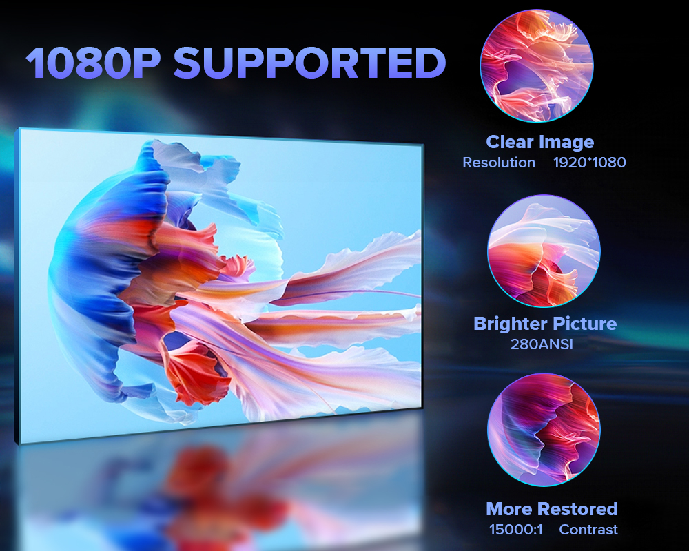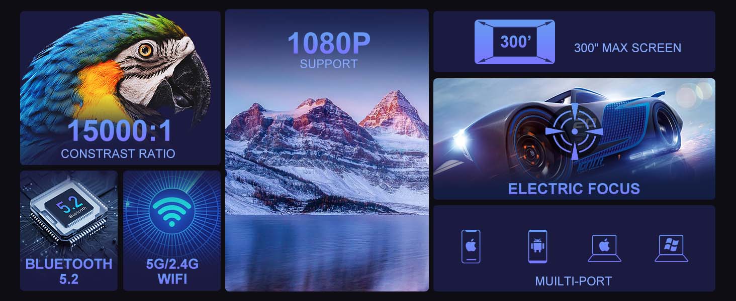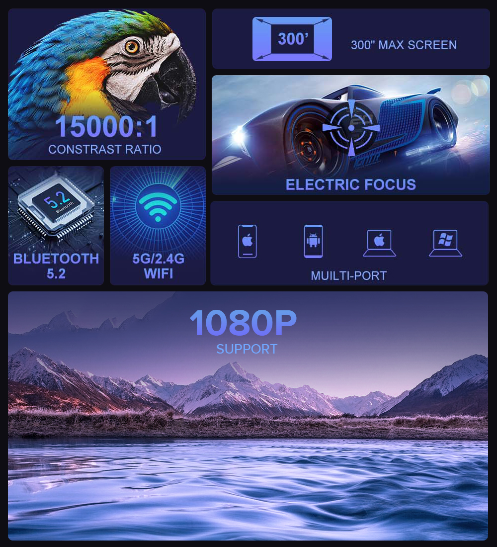 Ultrasnelle 5G WiFi en 5.2 Bluetooth Contrastverhouding van 15.000:1 Heldere beelden Ondersteuning voor autofocus en trapeziumcorrectie