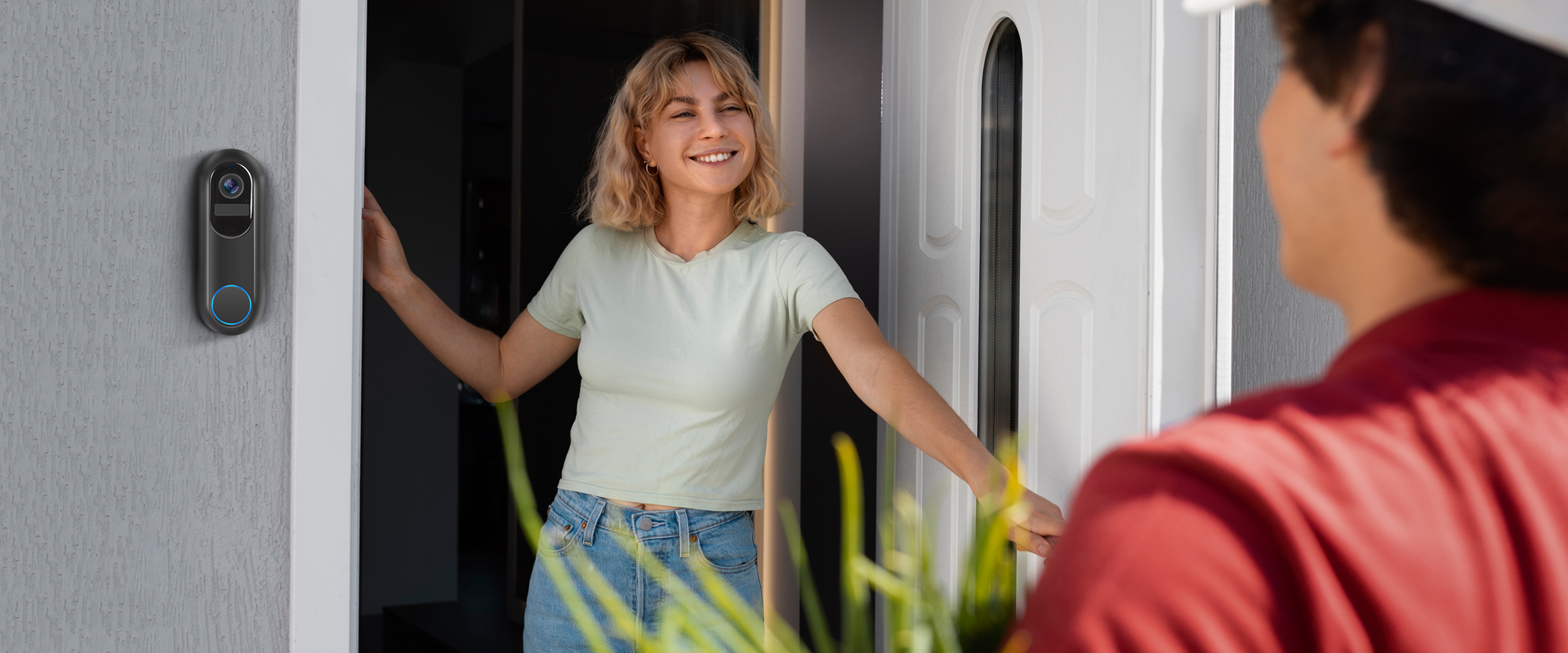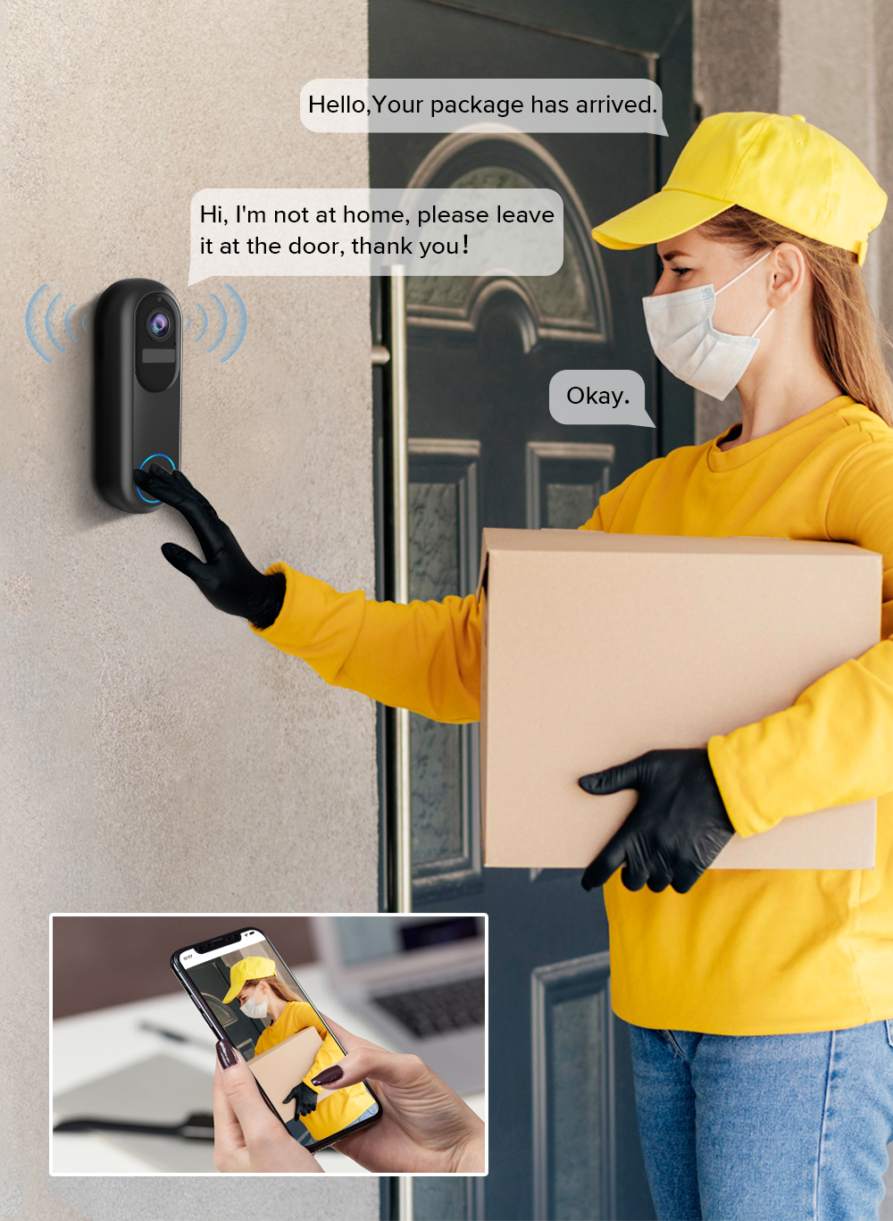Ingebouwde microfoon en luidspreker maken het gemakkelijk om met bezoekers te praten, of u nu thuis of buiten bent.